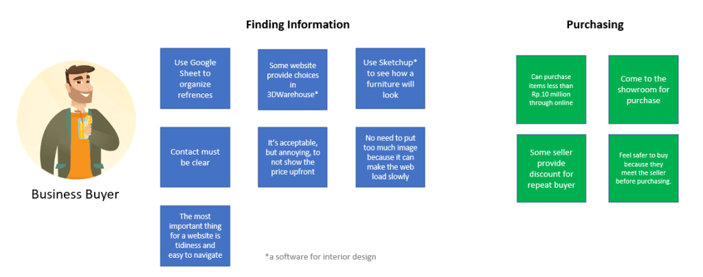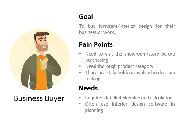 Another notable difference from previous category is that Business Buyer has longer decision making process before buying due to many stakeholders involved. They often use design interior software such as 3DWarehouse or Sketchup to preview the products.