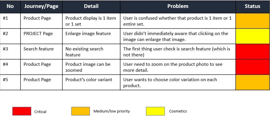 After we conducting usability test research, we discovered that user experiencing some issues when using our prototype to complete our scenario and tasks. We categorize the issues according to how crucial they are.